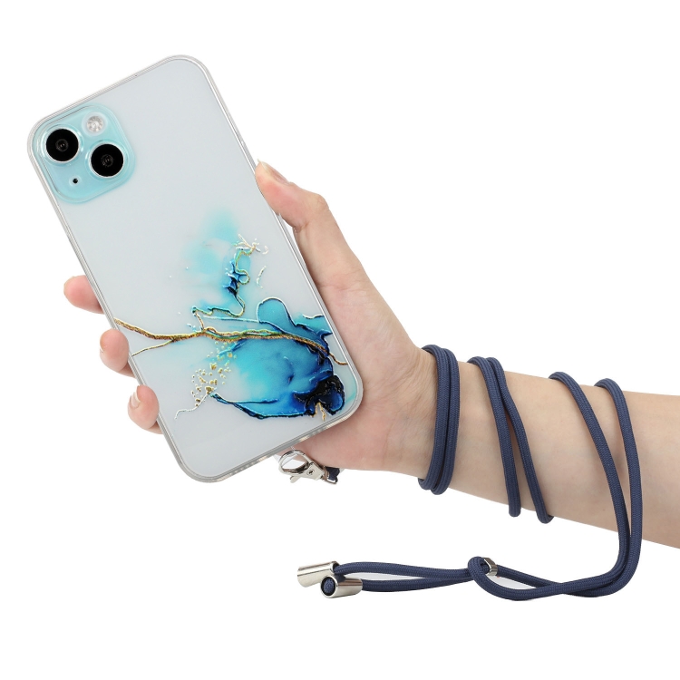 Estuche protector TPU para iPhone 14 Hollow Marble Pattern a prueba de golpes con correa para el cuello (Azul)