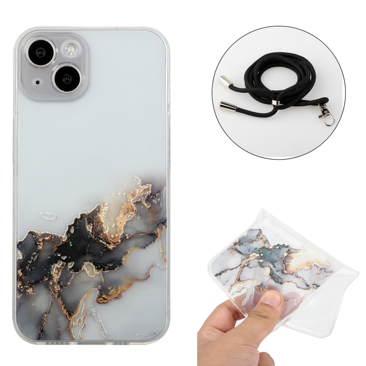 Estuche Protector TPU para iPhone 14 Hollow Marble Pattern a Prueba de Golpes con Correa para Cuello (Negro)