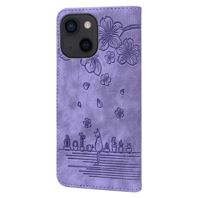 Funda para Teléfono iPhone 14 Plus Cuero Relieve Gato Sakura Dibujos Animados (Púrpura)