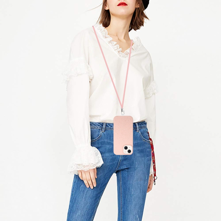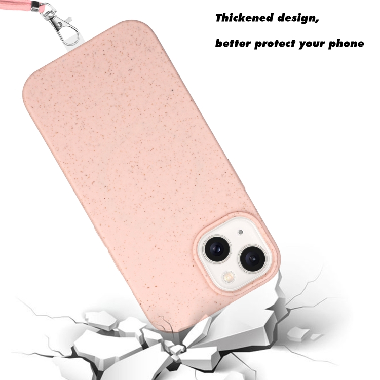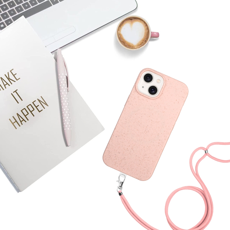 Funda para Teléfono iPhone 14 Plus Material de Paja Magnético Magsafe de Trigo TPU con Cordón (Rosa)