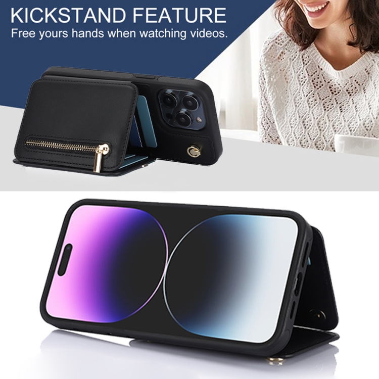 Estuche para Teléfono Ym006 para iPhone 14 Plus con Bolsa para Tarjetas y Cremallera con Cordón Doble (Negro)