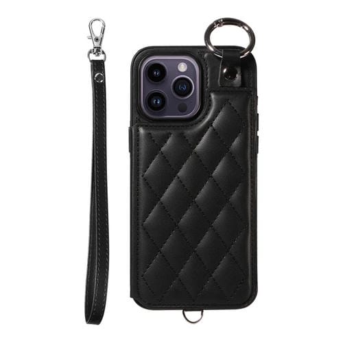Estuche para Teléfono iPhone 14 Pro Max con Bolsa para Tarjetas Textura Rómbica y Cordón Corto (Negro)