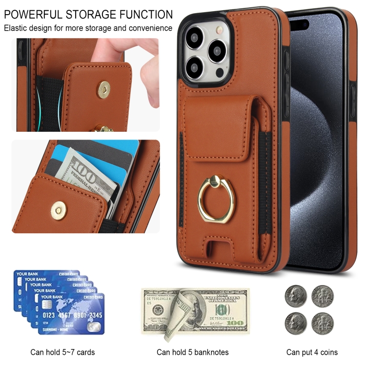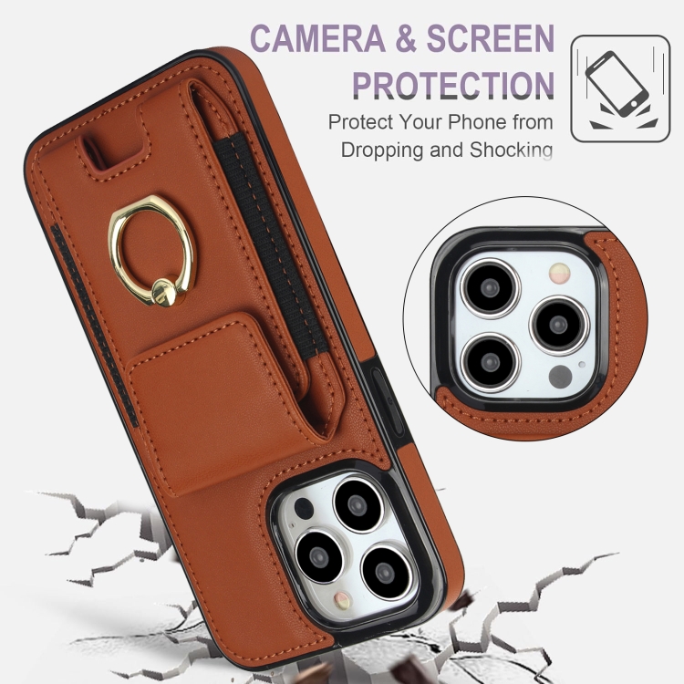 Funda para teléfono iPhone 14 Pro Max con soporte para anillo y bolsa para tarjetas (Marrón)