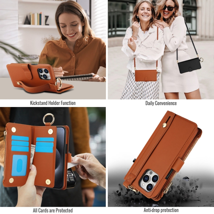 Funda para Teléfono iPhone 14 Pro Max Cuero con Billetera Multifuncional y Anillo Cruzado (Marrón)