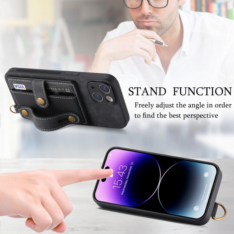 For iPhone 14 Retro Cross Wristlet Wallet Leather Phone Back Case Cover (Black)