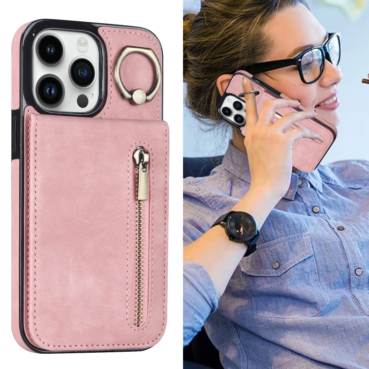 Funda para iPhone 14 Retro Ring y Zipper Rfid Card Slot (Rosa)