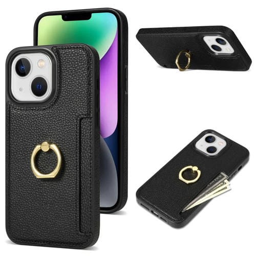 Funda Trasera para iPhone 14 Ring Card Litchi de Cuero (Negro)