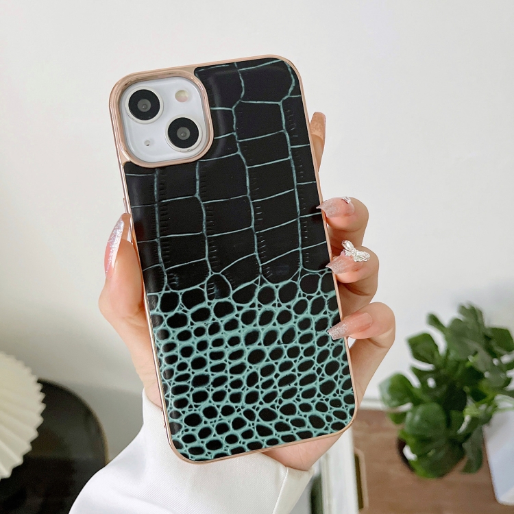 Funda de teléfono para iPhone 14 Textura de Cocodrilo Nano Galvanoplastia Cuero Genuino (Verde Oscuro)