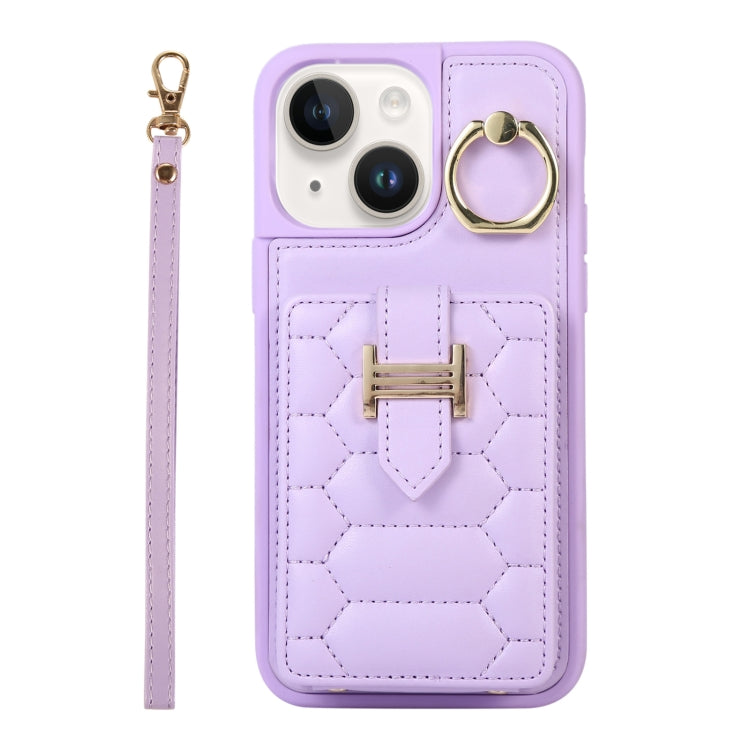 Funda para iPhone 14 Vertical Card Bag Ring Holder con Doble Cordón (Púrpura)