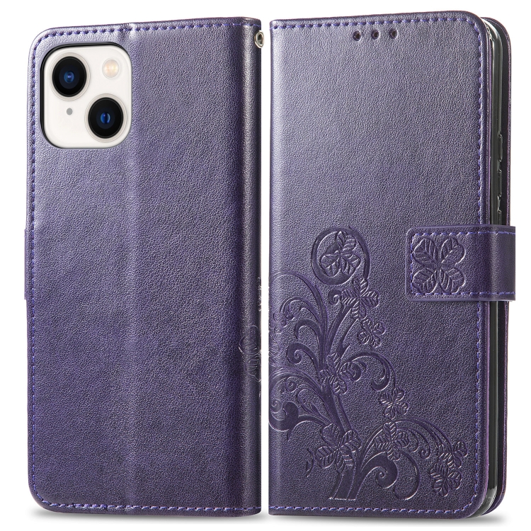 For iPhone 15 Embossed Buckle Leather Phone Case with Four-leaf Clasp (Purple)