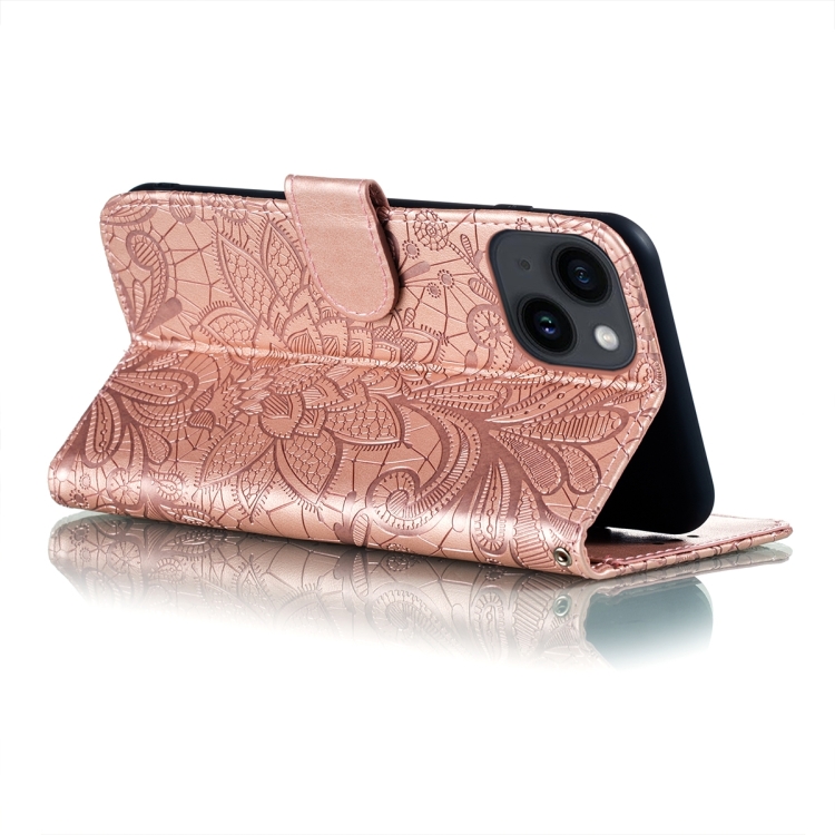Funda para iPhone 15 de Cuero con Tapa y Estampado de Flores de Encaje (Oro Rosa)
