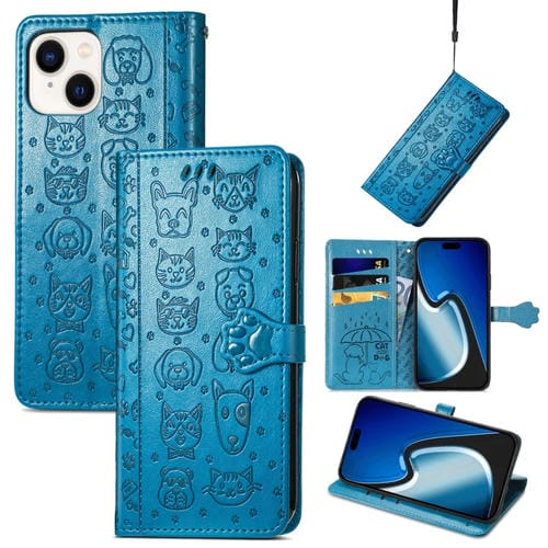 Funda de Teléfono para iPhone 15 Cuero con Relieve de Perro y Gato (Azul)