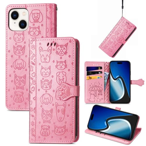 Funda de Teléfono Cuero para iPhone 15 con Relieve de Perro y Gato (Rosa)