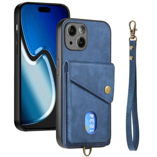 Funda de Teléfono iPhone 15 Cuero Plegable con Billetera y Tarjeta Retro con Correa (Azul)