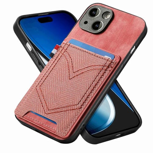 Funda de Teléfono iPhone 15 Piel de Cuero Textura Mezclilla Ranura para Tarjeta (Rosa)