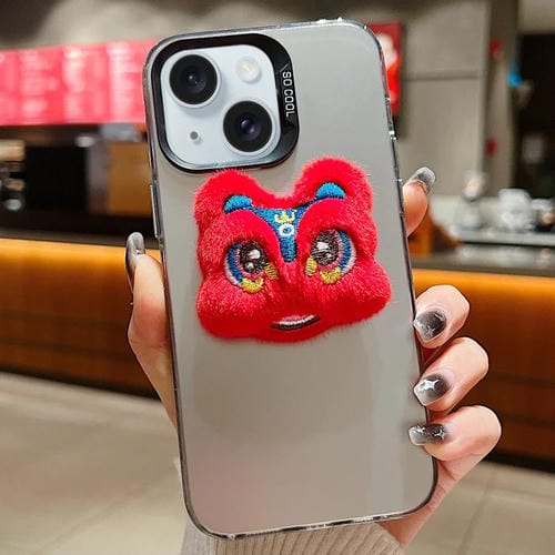 For iPhone 15 New Year Lion Dance Plush Doll Phone Case (Red Lion with Gray Back)