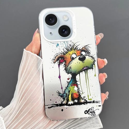 For iPhone 15 Phone Case IMD Animal Graffiti TPU+PC Double-sided (Orange Green Melt Dog)