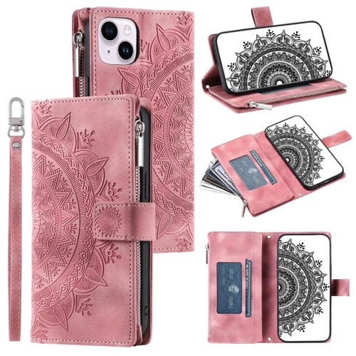 For iPhone 15 Multi-Card Totem Zipper Leather Phone Case (Pink)