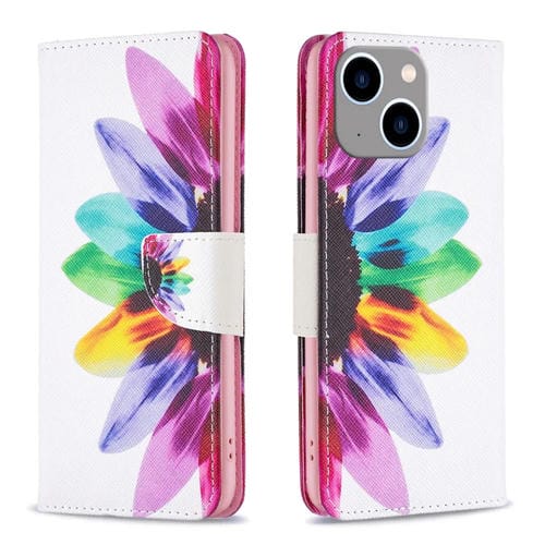 Estuche para Teléfono iPhone 15 Plus Cuero con Patrón Dibujo Coloreado (Flor del Sol)