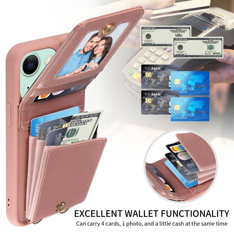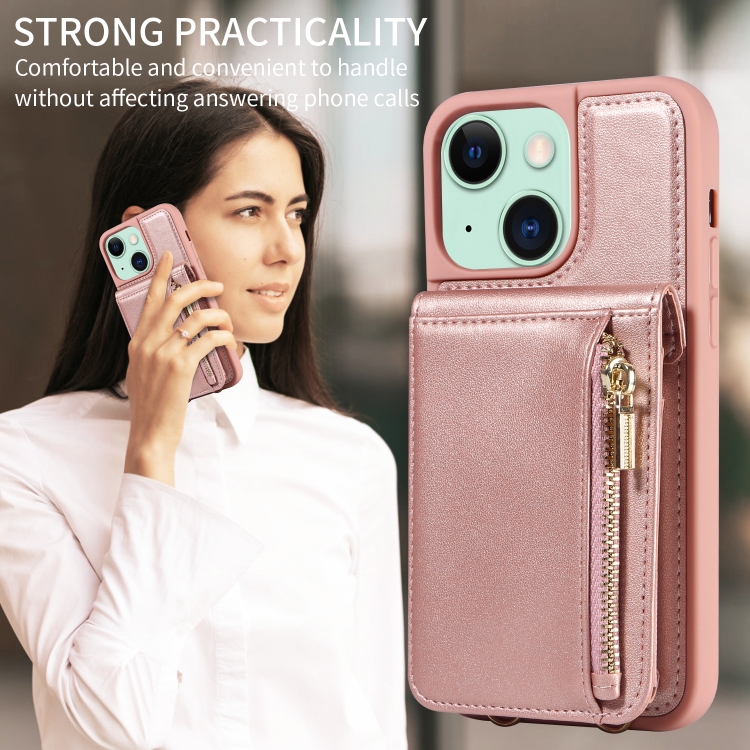 Funda para Teléfono iPhone 15 Plus Cuero Billetera Cremallera Cordón Cruzado (Oro Rosa)