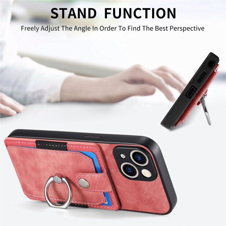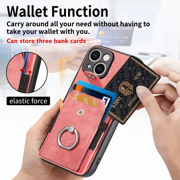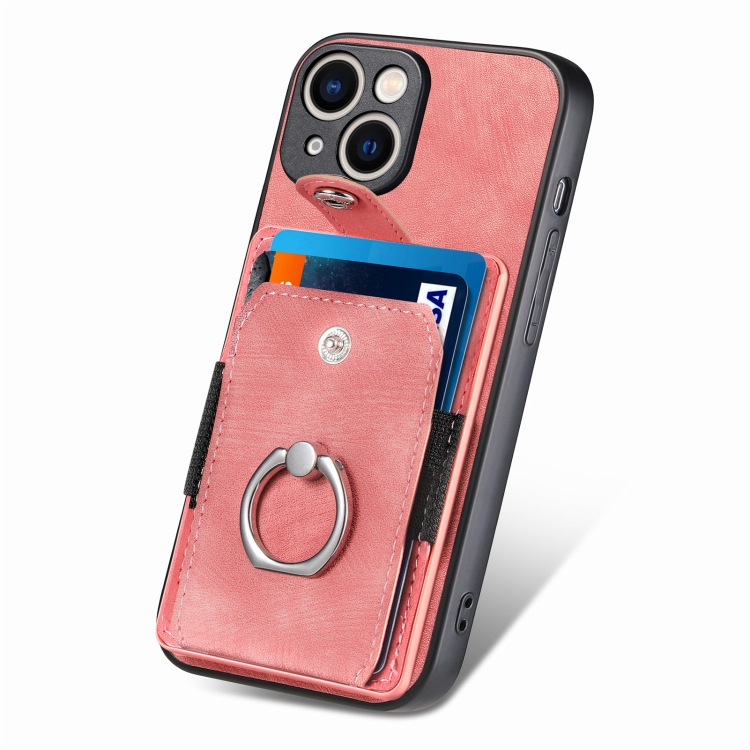 Funda para Teléfono iPhone 15 Plus con Billetera y Tarjeta con Anillo Sensación de Piel Retro (Rosa)