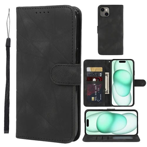Funda para Teléfono iPhone 15 Plus Skin Feel Cuero Líneas Geométricas (Negro)