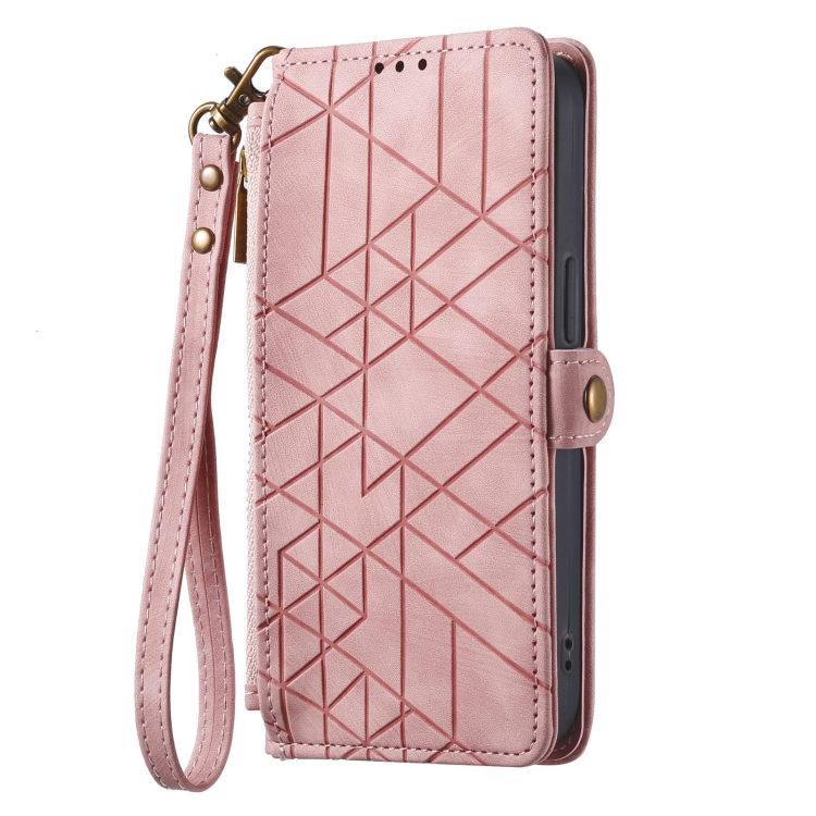 Funda Cartera para iPhone 15 Pro con Cremallera Geométrica y Hebilla Lateral de Cuero (Rosa)