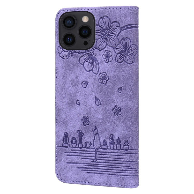 Funda de Teléfono iPhone 15 Pro Cuero Relieve Gato Sakura Dibujos Animados (Púrpura)