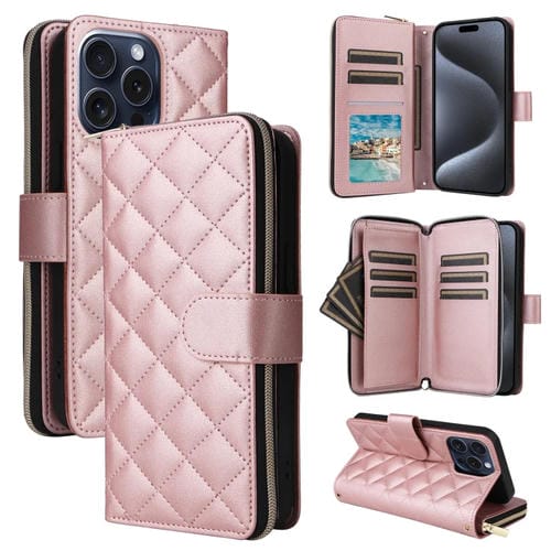 Funda para Teléfono iPhone 15 Pro Cuero Hebilla Torre Cremallera Rómbica Cruzada Cordón (Oro Rosa)