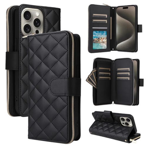Estuche para Teléfono iPhone 15 Pro Max Crossbody de Cuero con Hebilla de Torre y Cremallera Rómbica (Negro)