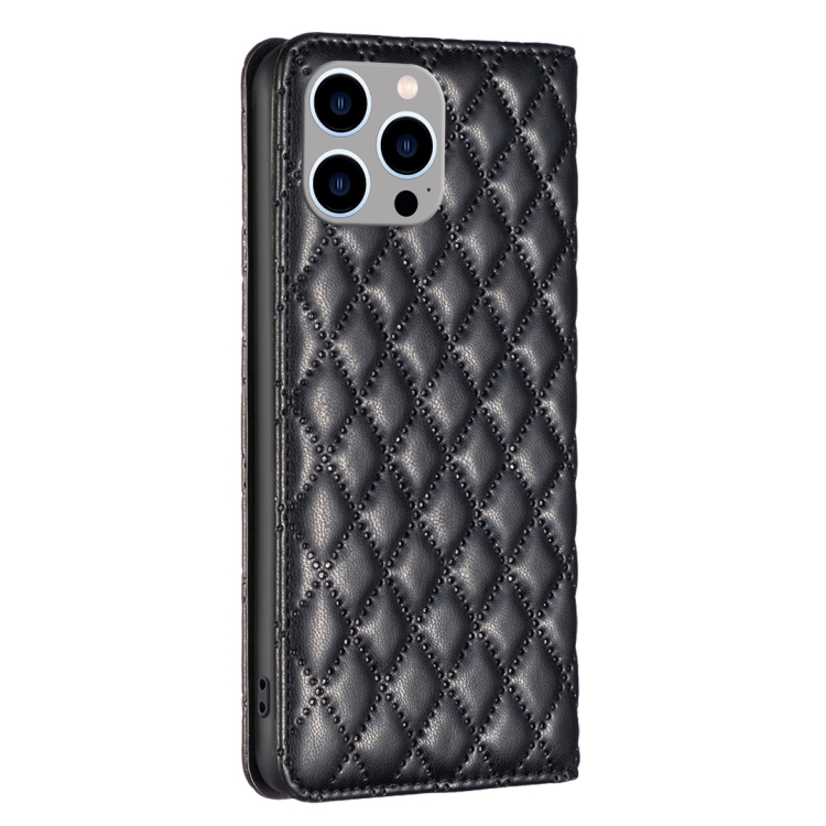 Funda de Teléfono para iPhone 15 Pro Max Diamond Lattice con Tapa de Cuero Magnético (Negro)