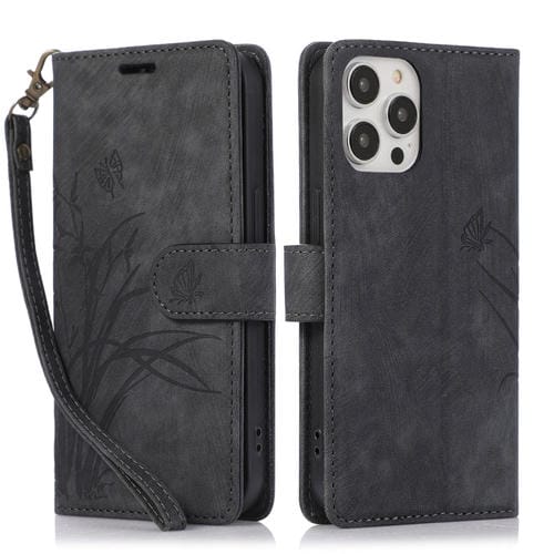 Funda para Teléfono iPhone 15 Pro Max Cuero con Relieve Mariposa Orquídea (Negro)