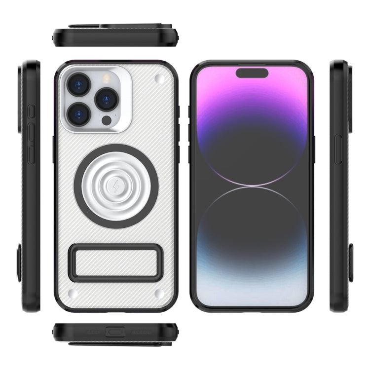 For iPhone 15 Pro Max Phone Case PC+TPU Carbon Fiber Texture with Metal Kickstand(White)