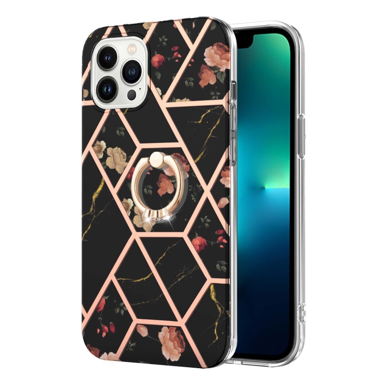 Funda TPU para iPhone 15 Pro Max Galvanoplastia Patrón Flor Mármol Soporte Anillo (Flor Negra)