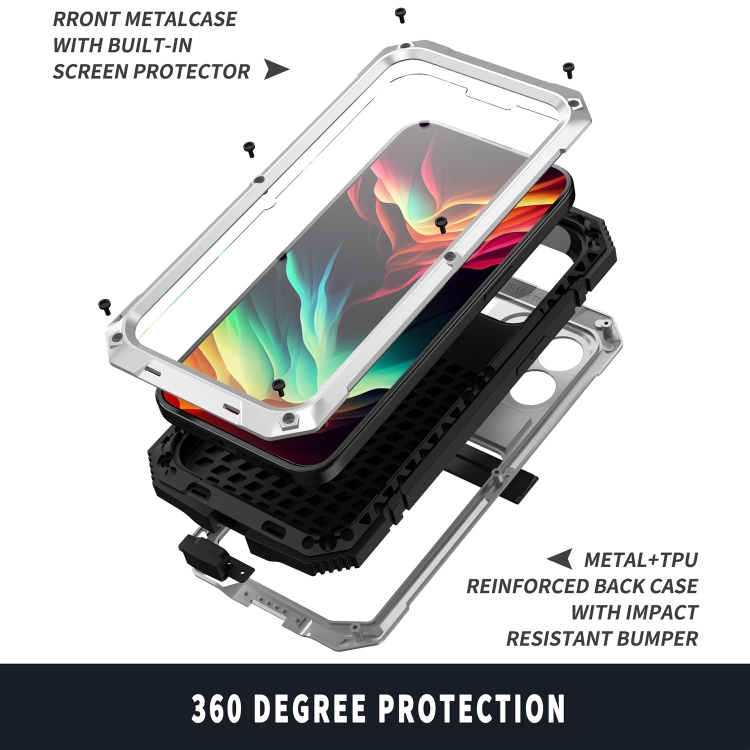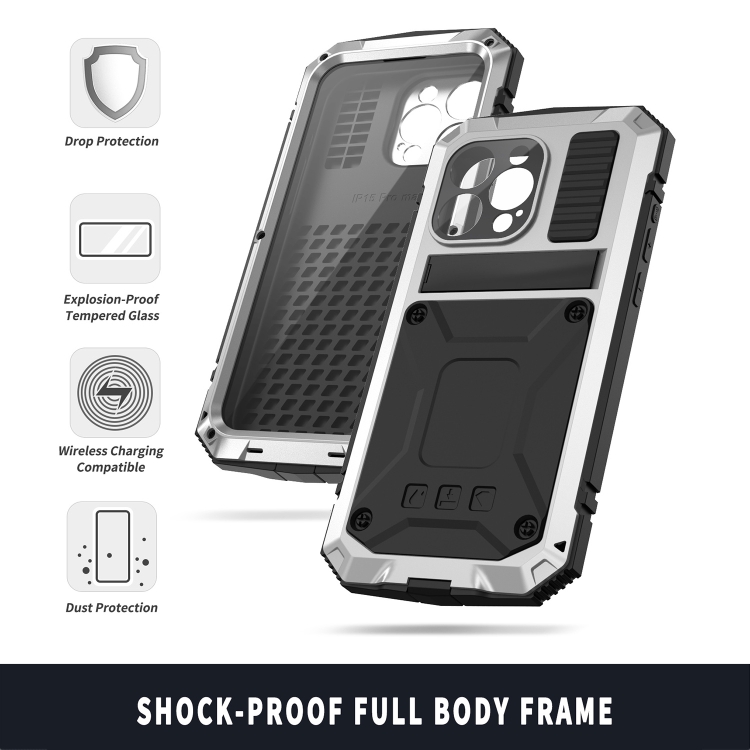 Funda para iPhone 15 Pro Max R-Just a Prueba de Golpes Resistente al Agua Metal y Silicona con Soporte (Plata)