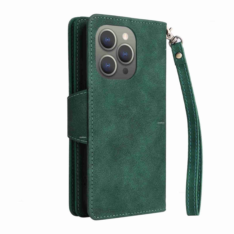 For iPhone 15 Pro Rivet Buckle 9 Cards Tri-fold Leather Phone Case (Green)