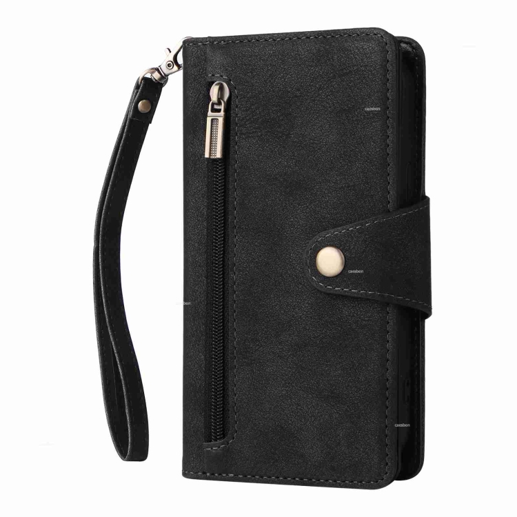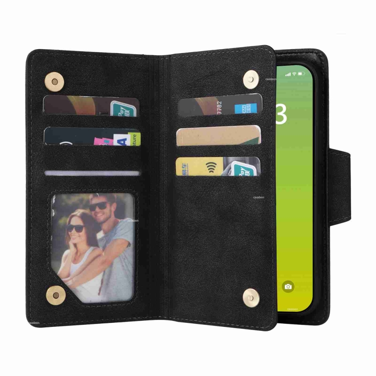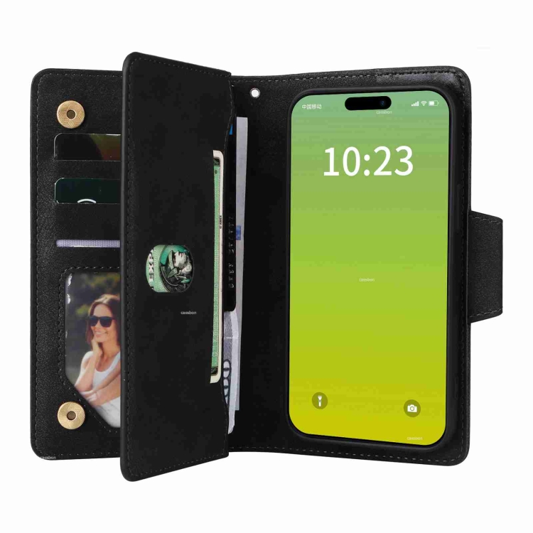 Funda para teléfono iPhone 15 Remache Hebilla 9 Tarjetas Tres Pliegues (Negro)