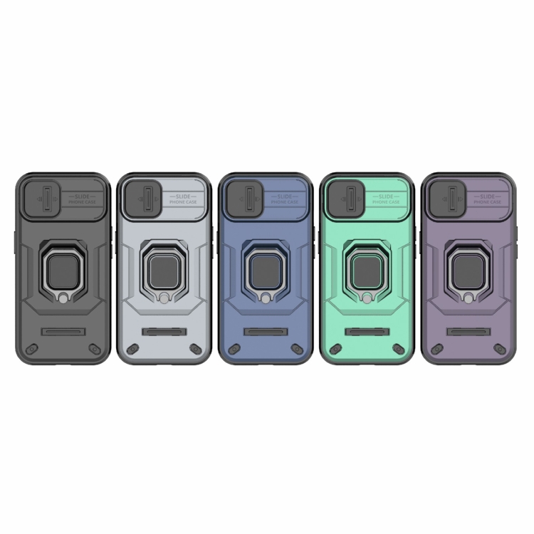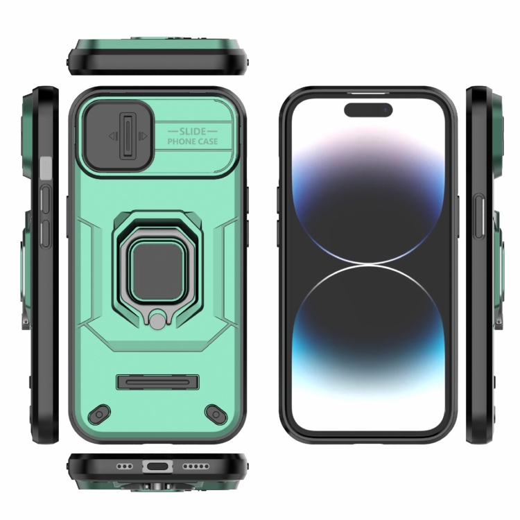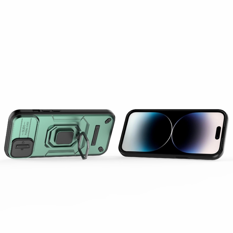 Estuche para Teléfono iPhone 15 Sliding Camshield TPU + PC a Prueba de Golpes con Soporte (Verde)