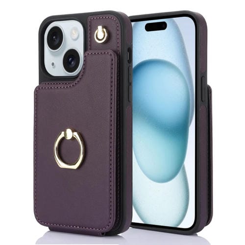 For iPhone 15 YM005 Skin Feel Card Bag Phone Case with Long Lanyard (Dark Purple)