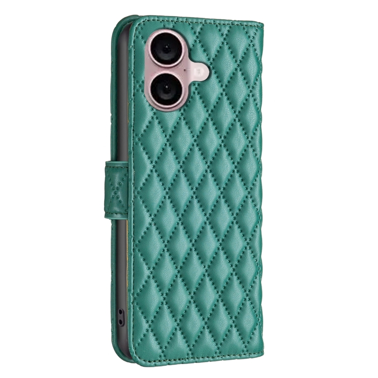 Funda para teléfono iPhone 16 Plus Diamond Lattice Wallet de cuero con tapa (Verde)