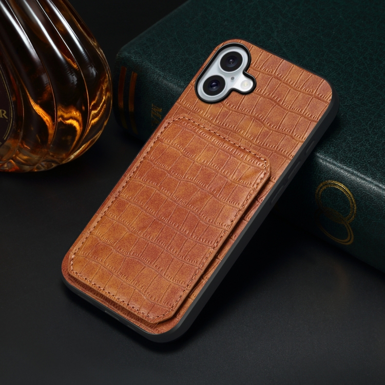 Funda Trasera para iPhone 16 Plus de piel de cocodrilo de imitación con soporte (Marrón)