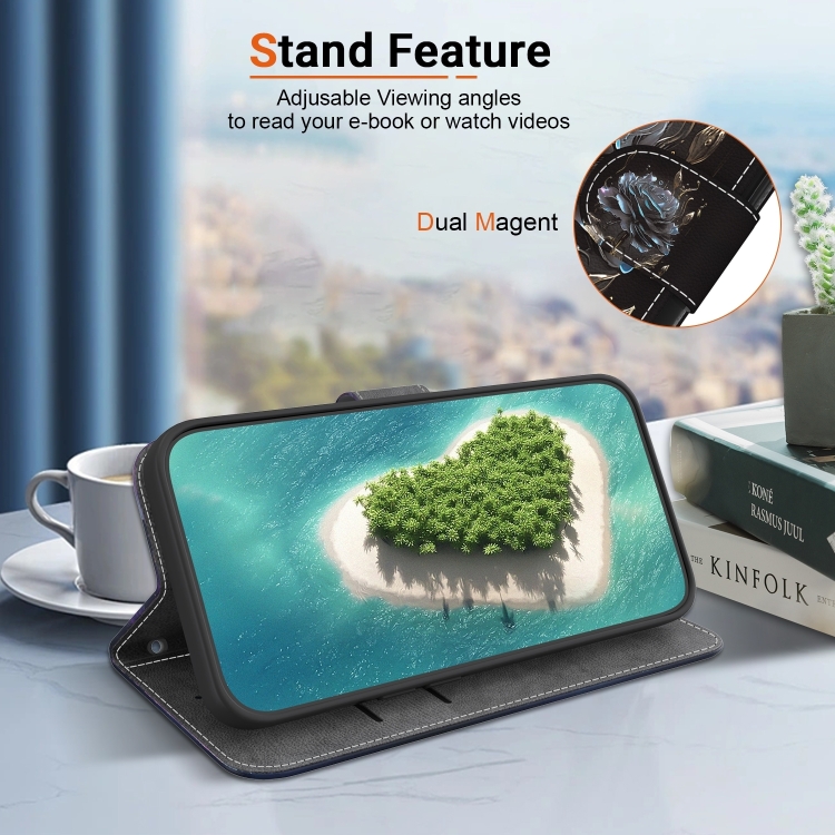 Estuche para teléfono iPhone 16 Pro Max Cuero con Dibujo Coloreado y Textura de Cristal (Rosa Negra)