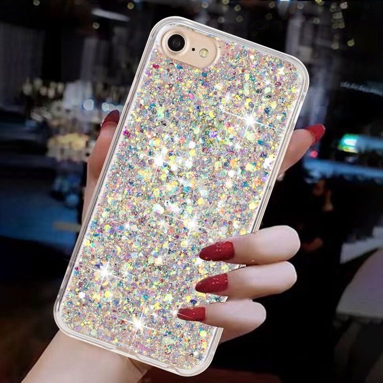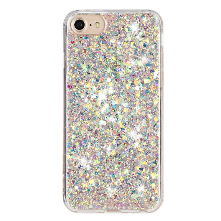 Caja de teléfono TPU para iPhone 8/7 con polvo de brillo y marco Transparente (Blanco)