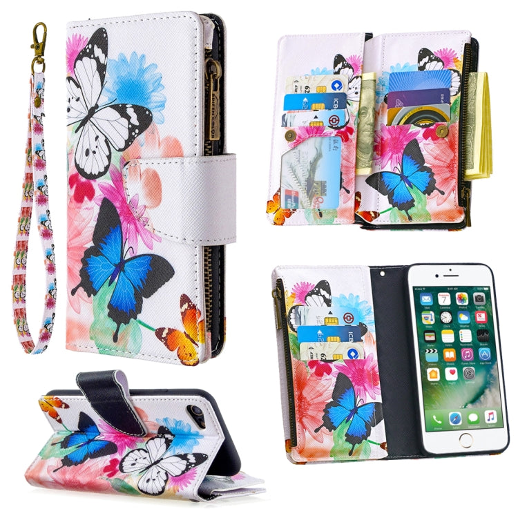 Funda de Cuero para iPhone 8 y 7 con Patrón de Dibujo de Colores, Cremallera, Tapa Horizontal, Soporte, Ranuras y Billetera (Dos Mariposas)