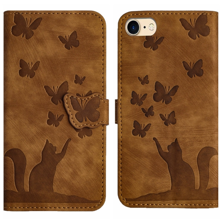 For iPhone SE 2022/2020/8/7 Butterfly Cat Embossed Flip Leather Phone Case (Brown)