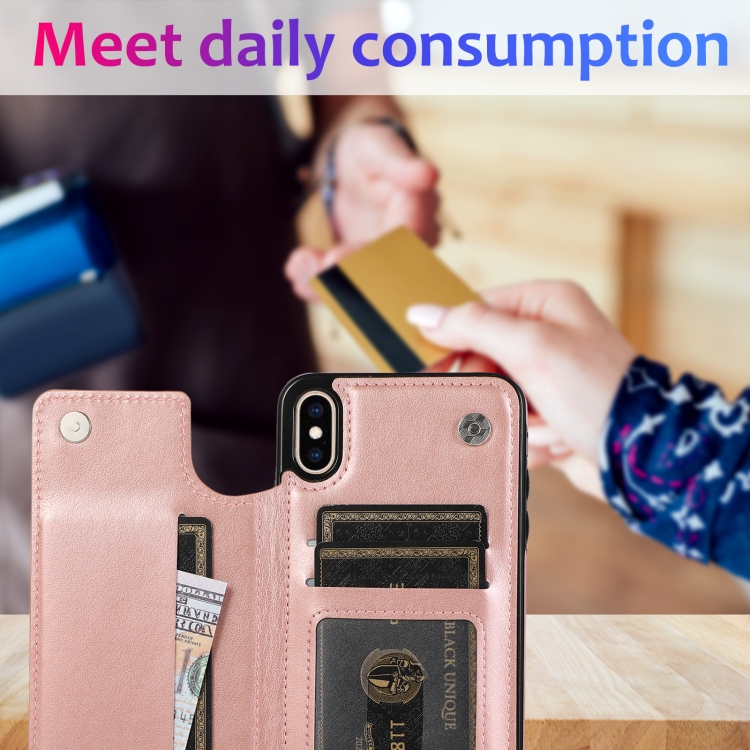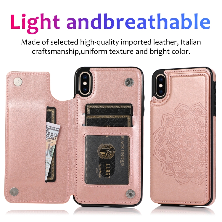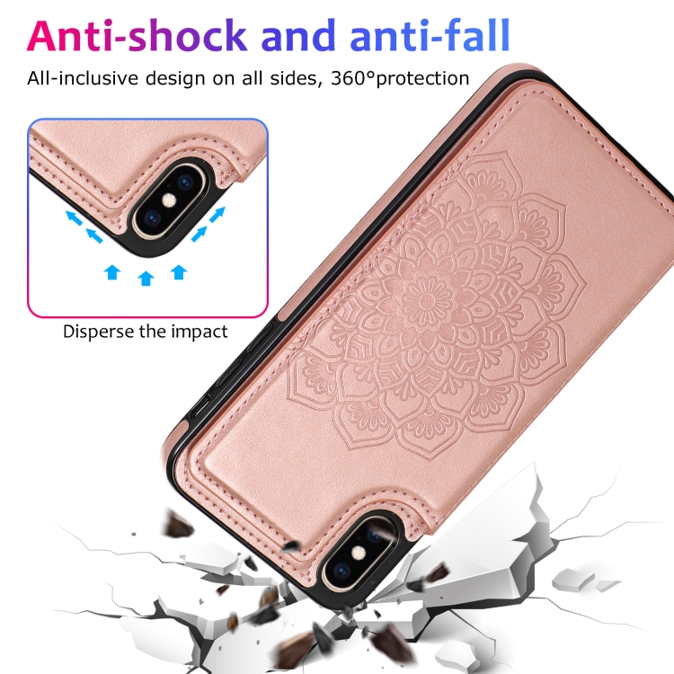 Estuche Protector Pu + TPU para iPhone X Xs con Patrón Mandala Doble Hebilla Ranuras Tarjetas Soporte Marco Fotos (Oro Rosa)