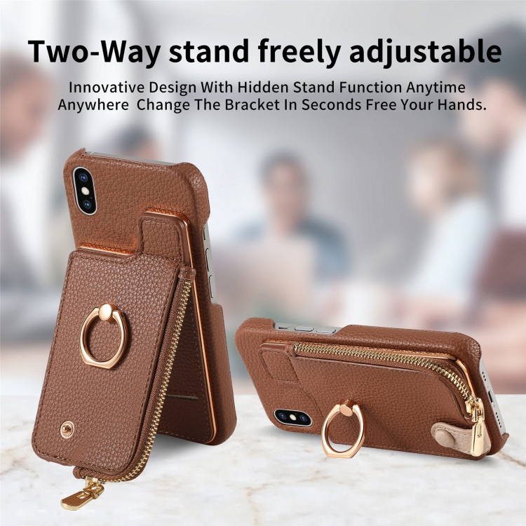 Funda Trasera para iPhone X Xs con Billetera, Cremallera y Anillo de Cuero Litchi (Marrón)