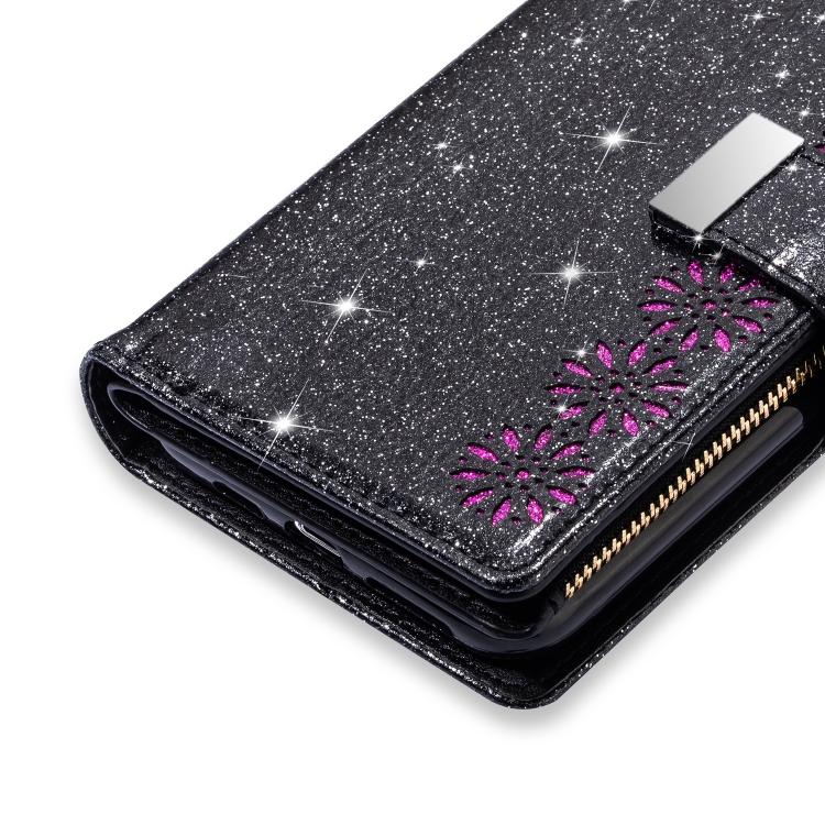 Funda para iPhone X / Xs Ranuras para Tarjetas Múltiples Starry Sky Laser Carving Glitter Zipper Cuero con Tapa Horizontal Soporte Billetera y Cordón (Negro)