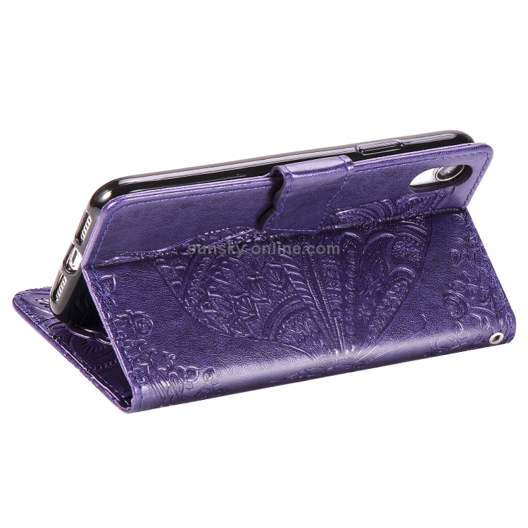 Estuche de Cuero para iPhone Xr Butterfly Love Flowers con Tapa Horizontal En Relieve Soporte Ranuras y Billetera (Púrpura Oscuro)