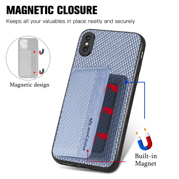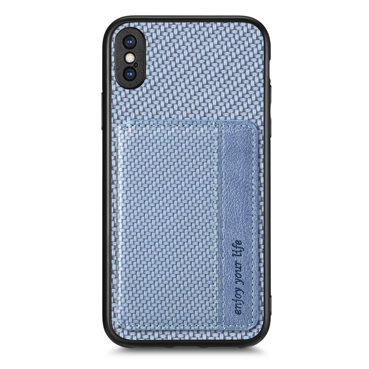 Caja de teléfono para iPhone Xs Max con bolsa de tarjeta magnética de fibra de carbono (Azul)